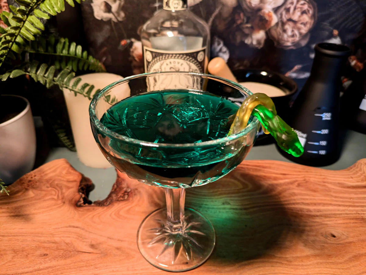 Add all the ingredients to a cocktail shaker with cubed ice and shake well until cold to the touch. Strain into a stemmed glass and garnish with a gummi snake.