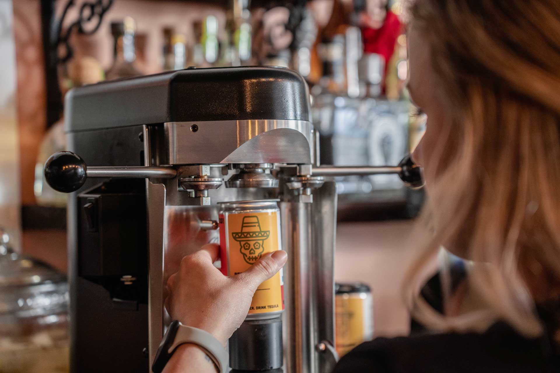 The Oktober can seamer is quiet, sleek, and smaller than your commercial coffee maker. Its plug-and-play design makes it easy to operate, clean, and train bartenders to master in seconds. Most people never consider how beverages end up fully enclosed in an aluminum cylinder. Placing the machine in a visible location can attract “what does that thing do?” questions that often end in a sale. Making a show of the process can add value to an otherwise common commodity. Educating customers in real time with a unique personal experience creates an impression. Your machine can become part of the bar’s aesthetic, with custom colors and wraps available to reinforce your branding and look sleek in your online promotions.