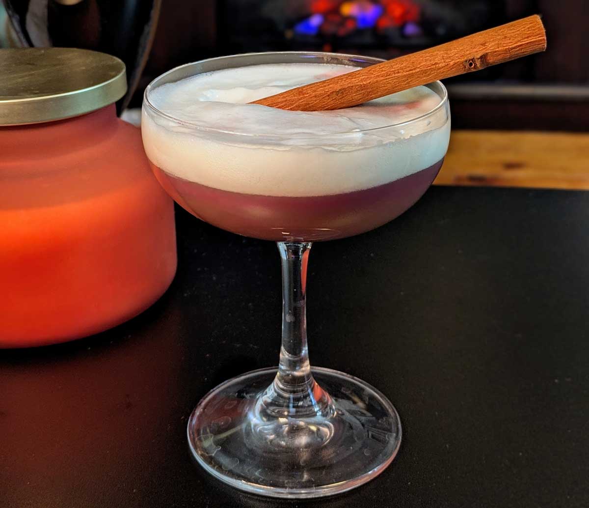 Add all the ingredients except the wine to a cocktail shaker without ice. Drop the spiral from a Hawthorne strainer into the shaker and shake well for 10 seconds. Add a handful of cubed ice and shake for another 10 seconds. Remove the spiral, rinse it, and put it back on the strainer. Strain into a cocktail glass, allowing the foam to gather on top. Pour the wine into a jigger, place a spoon face down over the cocktail, and slowly pour the wine over the back of the spoon. If desired, garnish with a cinnamon stick.