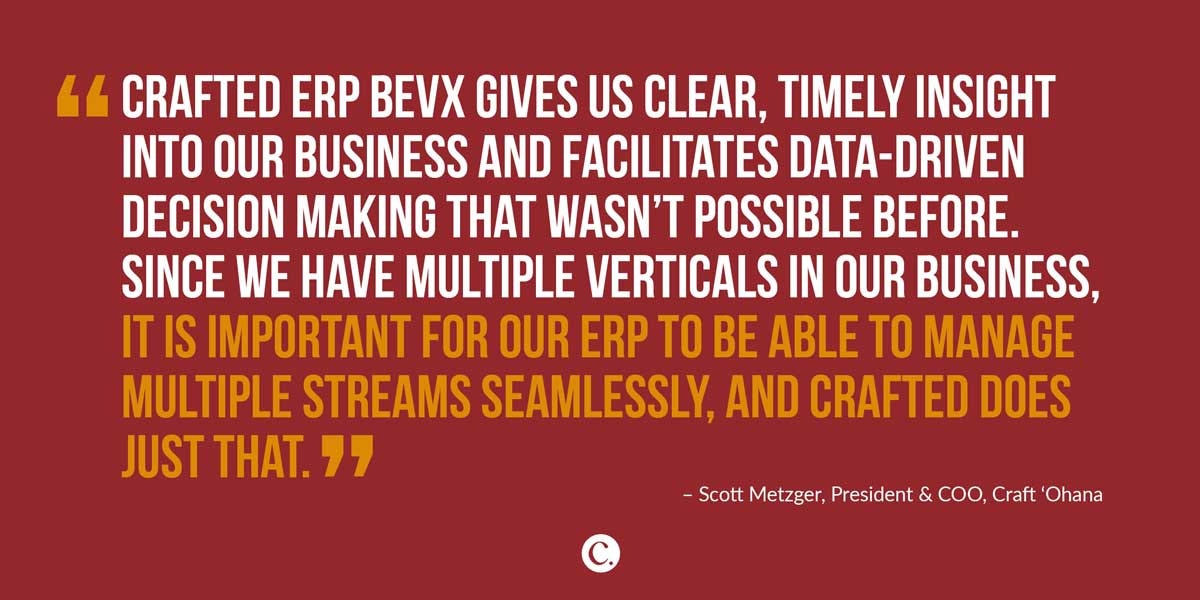 In 2022, Craft ’Ohana founder Garrett Marrero and president and COO Scott Metzger had a decision to make. Faced with the complexities of growing a multicategory beverage business in a saturated market, they knew their current software was too limited to support the depth and breadth of their vision. They needed an infinitely scalable, end-to-end solution with a 360-degree view of their compliance obligations, product lines, and brands. After an exhaustive search, they chose Crafted ERP BevX as the backbone of their current and future operations.