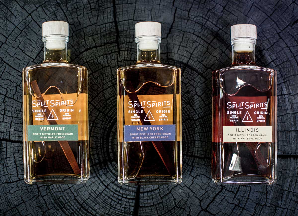 That may also include the lowdown on how, technically, wood-infused whiskey that’s not barrel-aged must be referred to as a whiskey-adjacent spirit; the three Split Spirits bottles are labeled as “spirit distilled from grain.”