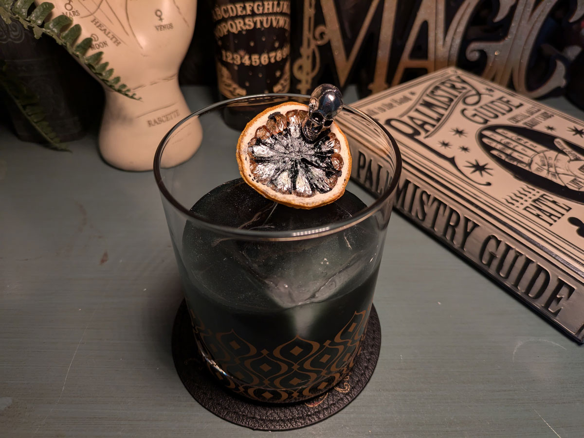 This cocktail is like apple pie in a glass. Sage and bitters create balance and an edge. Adding black coloring and a bit of smoke makes it wickedly perfect for Halloween drinking.
